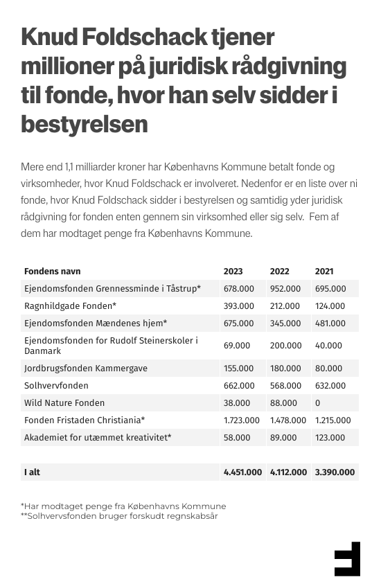 Det fremgik også tidligere af artiklen, at Københavns Kommune havde betalt 1,125 milliarder kroner til fonde, hvor Knud Foldschack har været eller er involveret. Københavns Kommune har efter artiklens udgivelse bragt en rettelse i deres opgivelse. Det korrekte tal er derfor 1,117 milliarder kroner, og det er rettet i teksten.